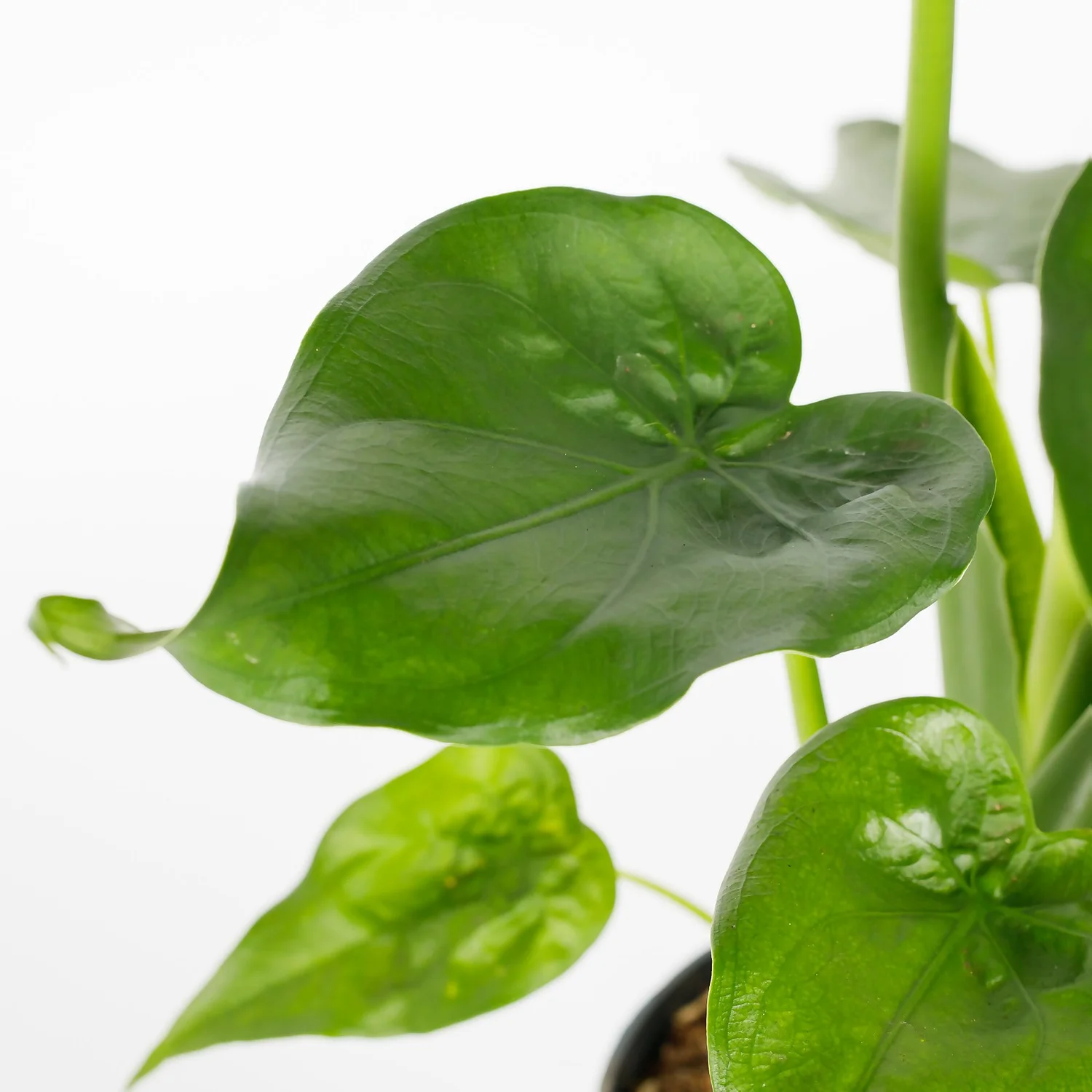 A green houseplant with huge green leaves. The Alocasia is happy in a medium, well-lit well-lit room. They like to be watered evenly and prefer to dry out in between waterings as they don’t like to be soggy. Happiest in a bright room.