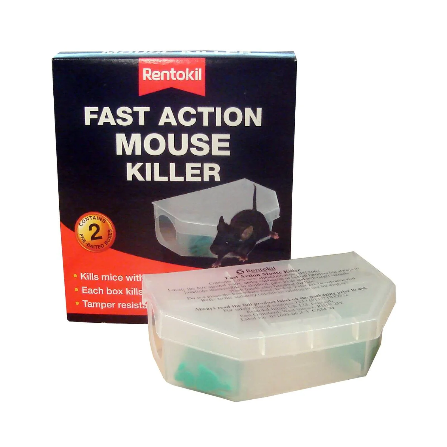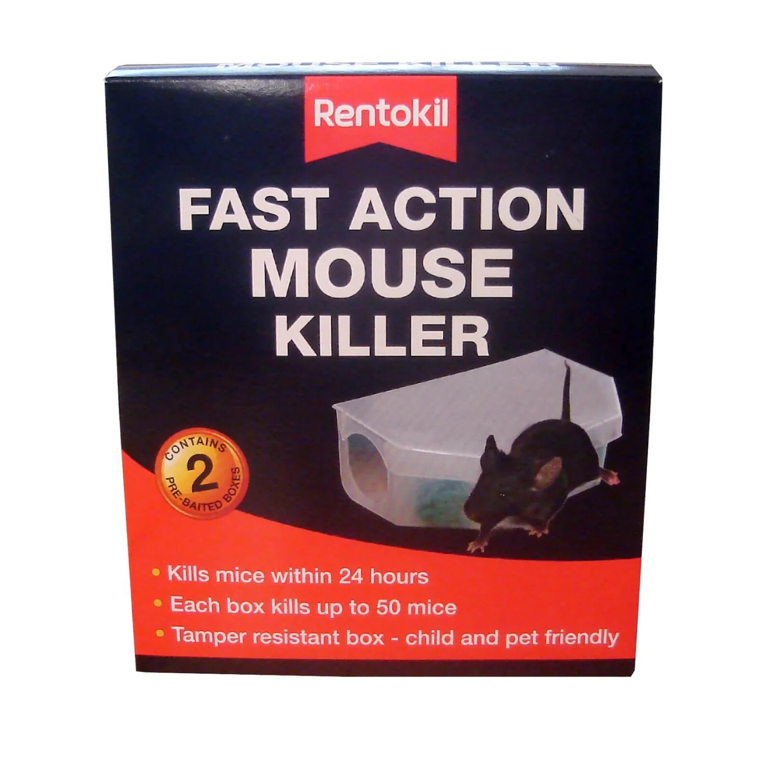This Fast Action Mouse Killer can kill mice within 24 hours. Each box will kill up to 50 mice and the box has a tamper resistant design, so is child and pet friendly.