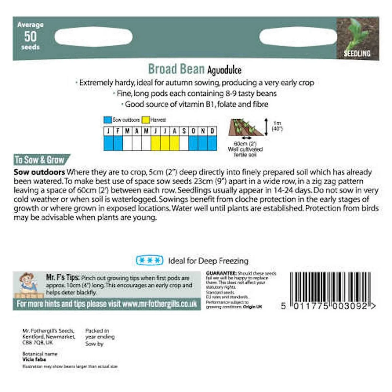 Broad Bean Aquadulce (Vicia faba) is a cold tolerant early sowing longpod variety with up to 8 – 9 tasty beans in each pod.