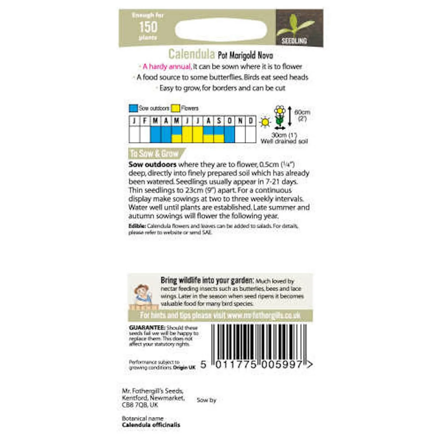 Calendula Pot Marigold Nova (Calendula Officinalis) is a brightly coloured easy to grow favourite and great food source for wildlife. Attractive to bees and insects. For drifts or as an easy filler in mixed summer borders and for cutting gardens.