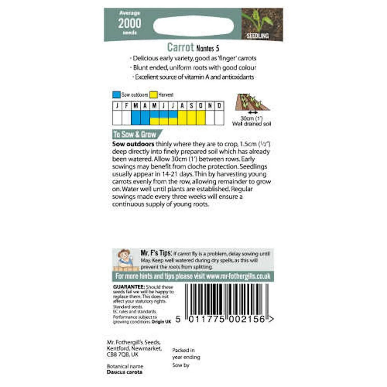 Carrot Early Nantes 5 (Daucus carota) is a great tasting early variety with blunt ended roots which are great as young finger carrots. An excellent source of vitamin A and antioxidants.