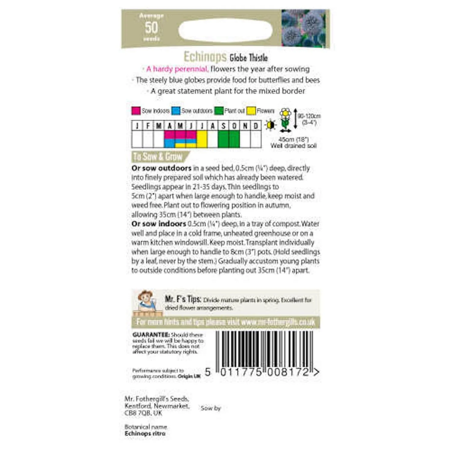 Echinops Globe Thistle (Echinops ritro) develops remarkable steely blue globe shaped flowers. Flowers attractive to beneficial insects. Fabulous for colourful borders and cutting gardens.