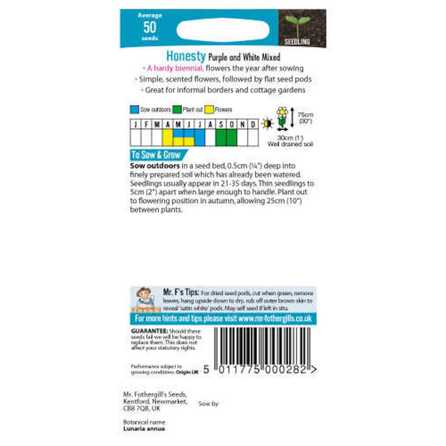 Scented purple or white flowers followed by attractive flat silvery-white seed heads. The dried seed heads are perfect for indoor arrangements.