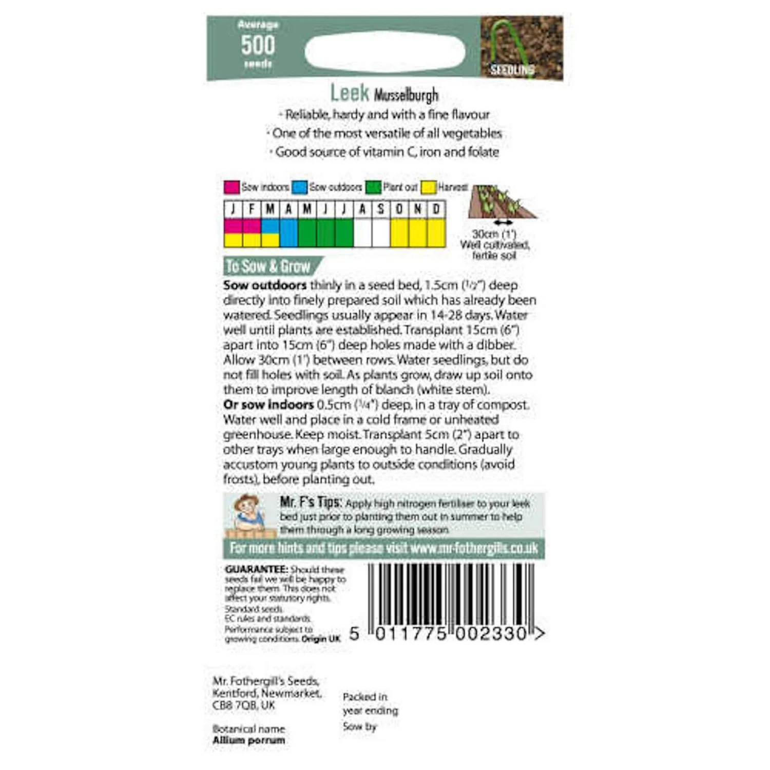 Leek Musselburgh (Allium porrum) is a classic hardy and reliable variety with thick great tasting stems. A good source of vitamin C folate and iron.