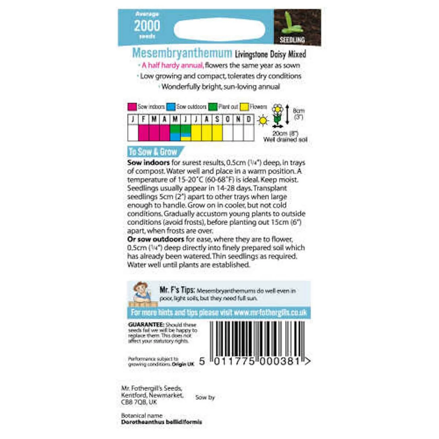 Mesembryanthemum Livingstone Daisy Mixed (Dorotheanthus Bellidiformis) forms low-growing plants with jewel bright flowers which open in full sun. Great for edging tubs and containers.