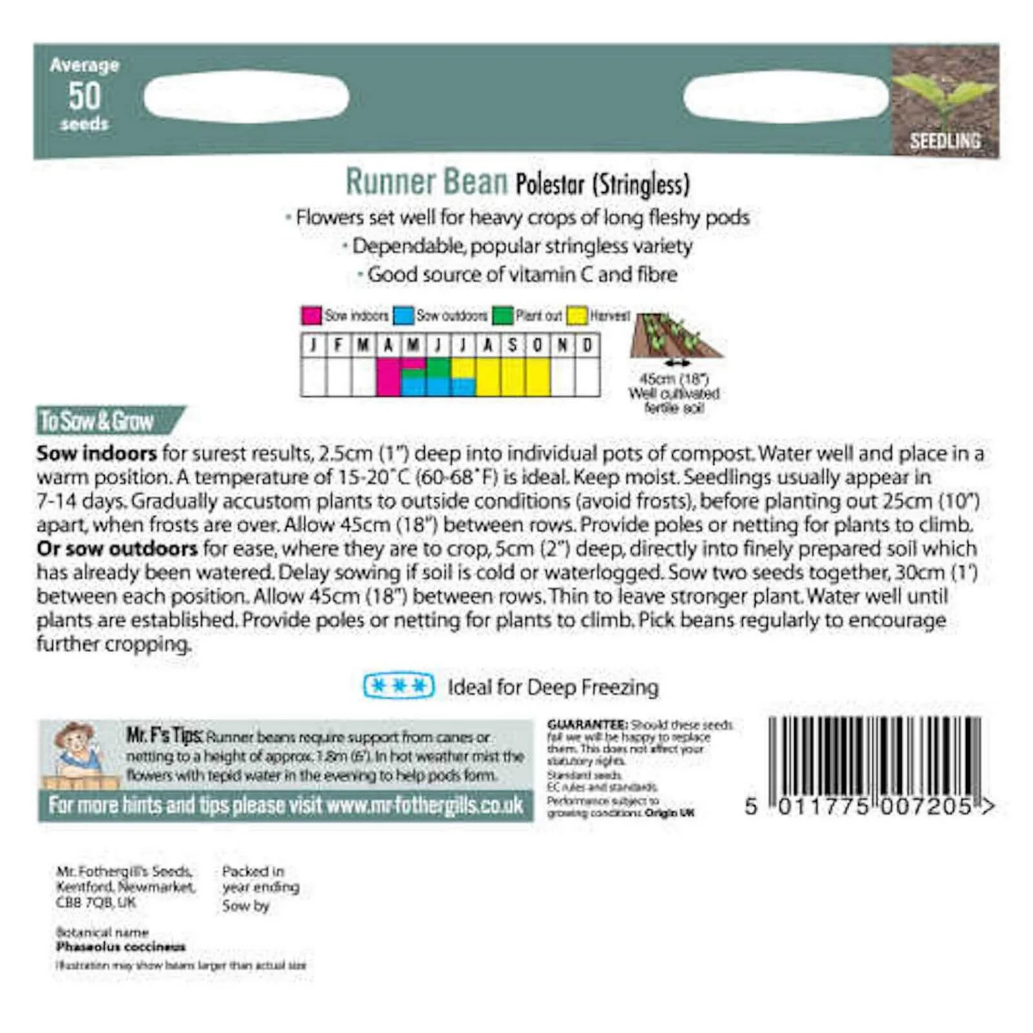 Runner Bean Stringless Polestar (Phaseolus coccineus) is a well known and dependable stringless variety for heavy crops of fleshy pods.