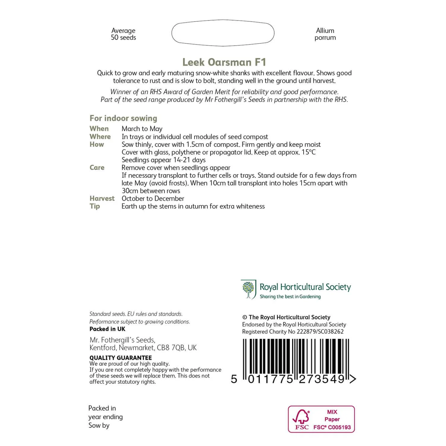 Quick to grow and early maturing snow-white shanks with excellent flavour. Shows good tolerance to rust and is slow to bolt, standing well in the ground until harvest. Winner of an RHS Award of Garden Merit for reliability and good performance.
