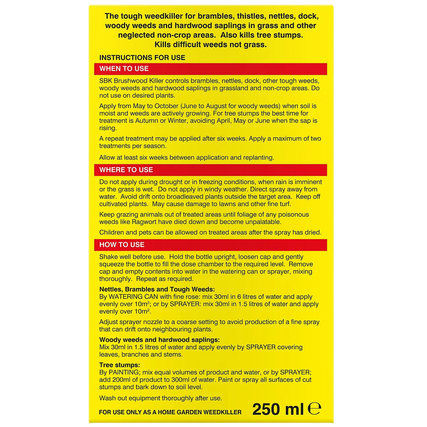 | Additional Information | This tough weedkiller has become a leading name for the effective control of brambles, thistles, nettles, dock, woody weeds and unwanted saplings and can also be used to kill off tree stumps. SBK Brushwood Killer has been specially formulated to kill weeds without harming grass and can be used safely in grassy areas but should not be used on fine turf. It is also ideal for treating neglected, non-crop areas. SBK should be used on tough and woody weeds in the spring/summer, and on tree stumps in the autumn/winter. |